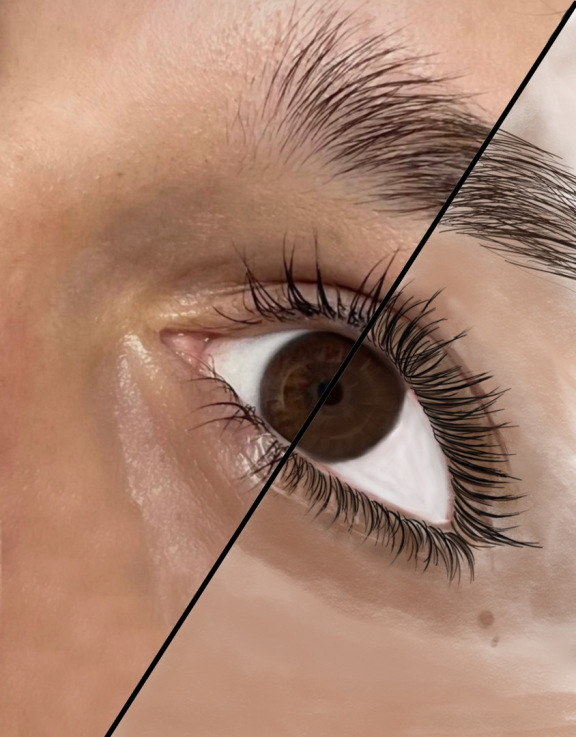 Hinter dieser Arbeit steckt keine großartige Idee, es war eher eine Art Übung, bei der ich mich ein wenig vertrauter machen wollte mit meinem iPad und dem Apple Pencil. Da ich gerne zeichne und male, wollte ich es also mal auf dem digitalen Weg versuchen, indem ich ein Bild von meinem Auge unterteile und die rechte Hälfte nachmale bzw. ergänze.