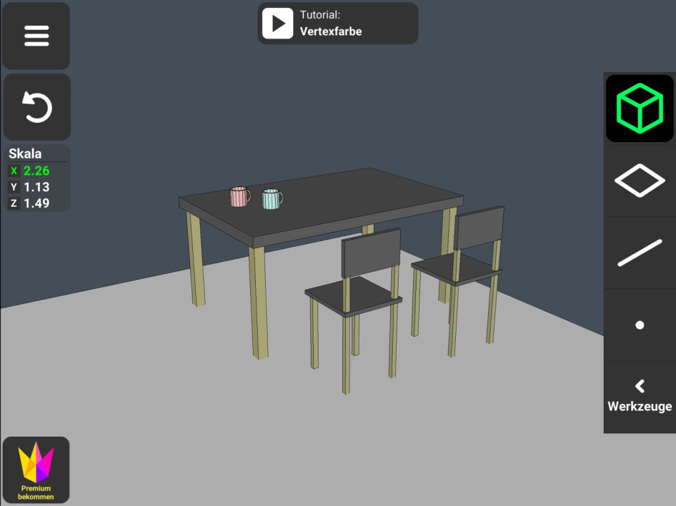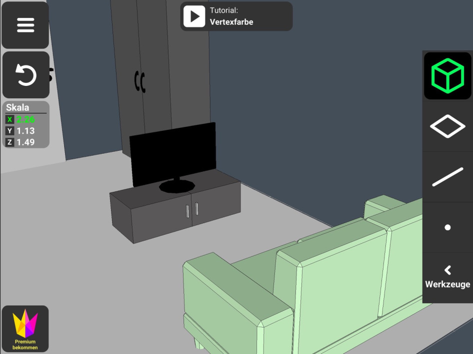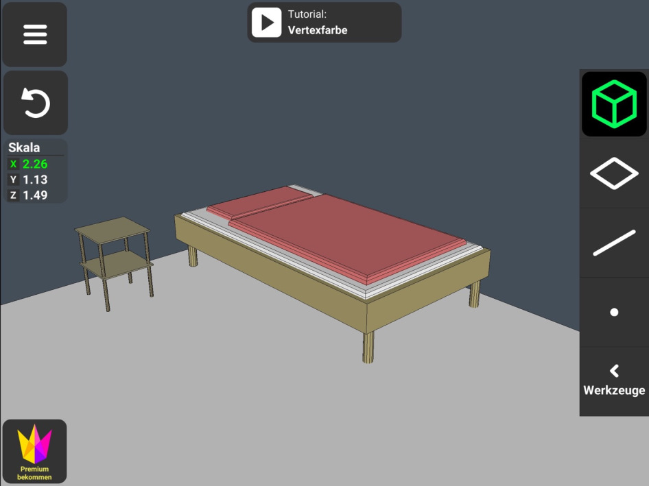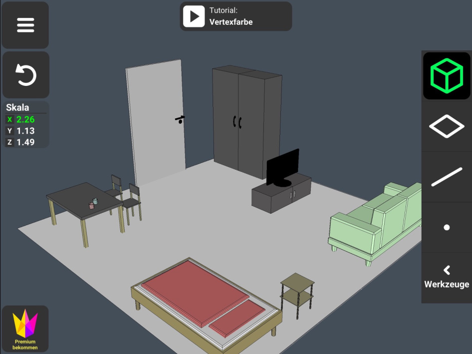 Alle Möbel im Zimmer habe ich hier selbst erstellt, bis auf die Couch, die eine Vorlage der App war, welche ich als Orientierungspunkt für die Möbel zur Verfügung haben wollte.