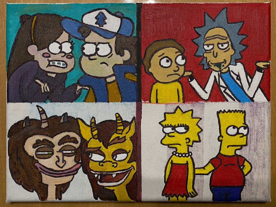 Wenn ich vorm Fernseher sitze, muss ich mich nebenbei immer mit irgendwas beschäftigen. Oft fange ich dann an, irgendwelche Bilder mit Acryl-Farbe zu malen. Als ich an einem Tag vorm Fernseher saß, brauchte ich wieder was zu tun, also suchte ich mir irgendeine Serie raus und da kam mir auch schon direkt die Idee, Figuren aus Zeichentrickserien zu malen. Die Auswahl davon war groß, also habe ich mir die Serien rausgesucht, die ich am komischsten fand und ihre Hauptcharaktere ausgewählt.
